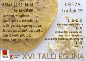 Igande honetan (irailak 19), Leitzako XVI. Talo eguna izango da. Bertan, taloa protagonista izan arren, ekoizle eta artisau postuak izanen dira, umeentzako talo tailerra eta dj porru, eta talo lehiaketa ere ospatuko da. informazio gehiagoTALO EGUNA 2021_ PRENTSA OHARRA Aurkezpena