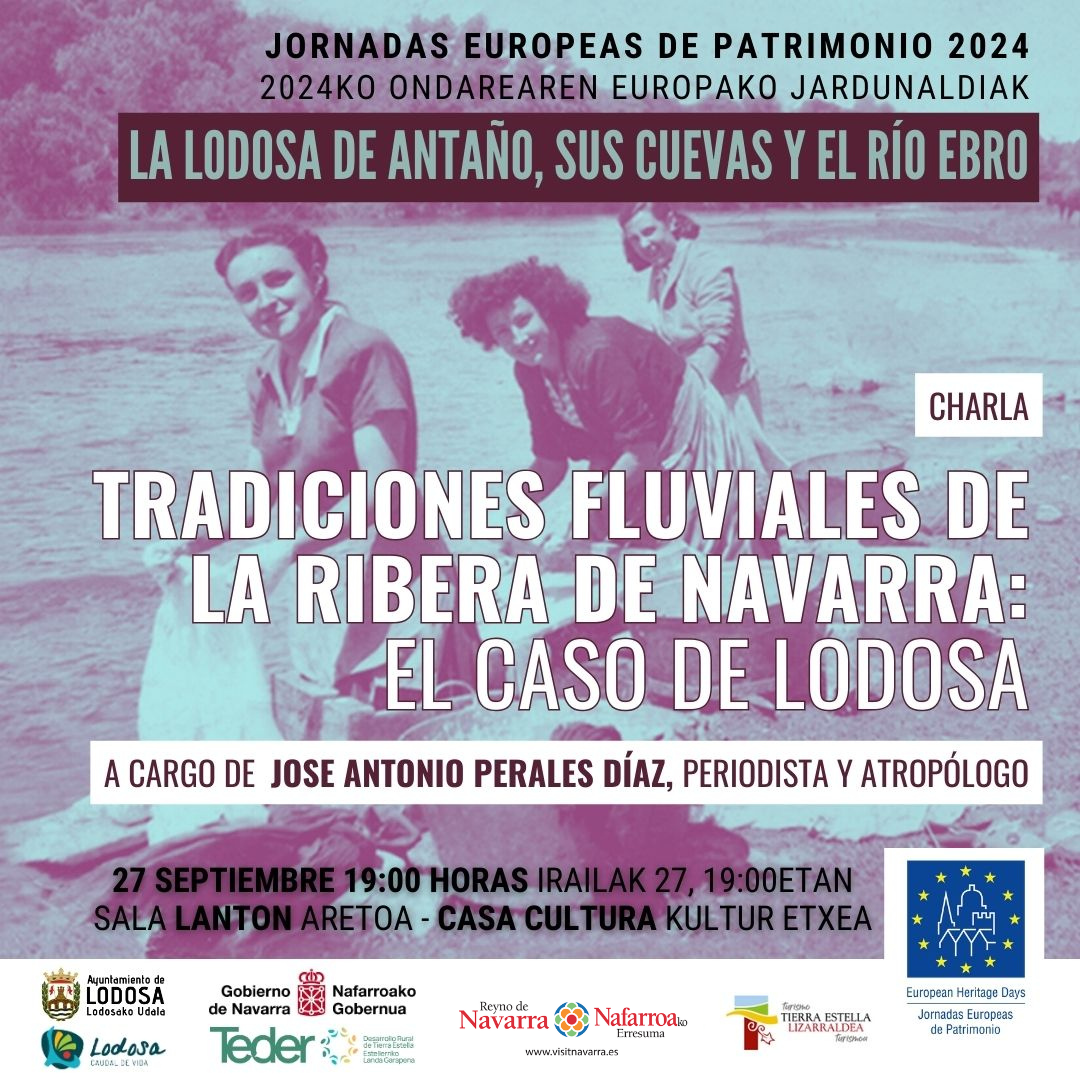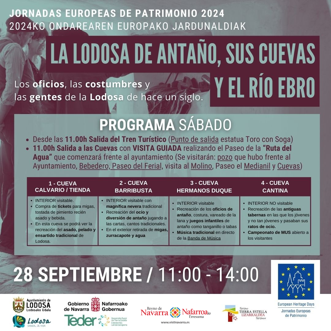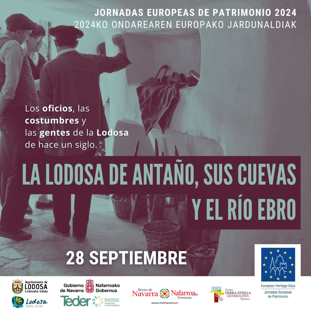 ¿Quieres adentrarte en la vida de la Lodosa de antaño y sus cuevas? Este sábado 28 de septiembre dentro de las Jornadas Europeas de Patrimonio esta localidad de de Tierra Estella-Lizarraldea revivirá antiguos oficios y costumbres de épocas pasadas y nos hará descubrir a sus gentes… ¡de hace un siglo! Este año con guiño a las tradiciones fluviales y su río Ebro. Desde las 11:00 hasta las 14:00 horas. El programa del sábado se completará con una charla impartida el viernes 27 en torno a las tradiciones fluviales y el río Ebro.