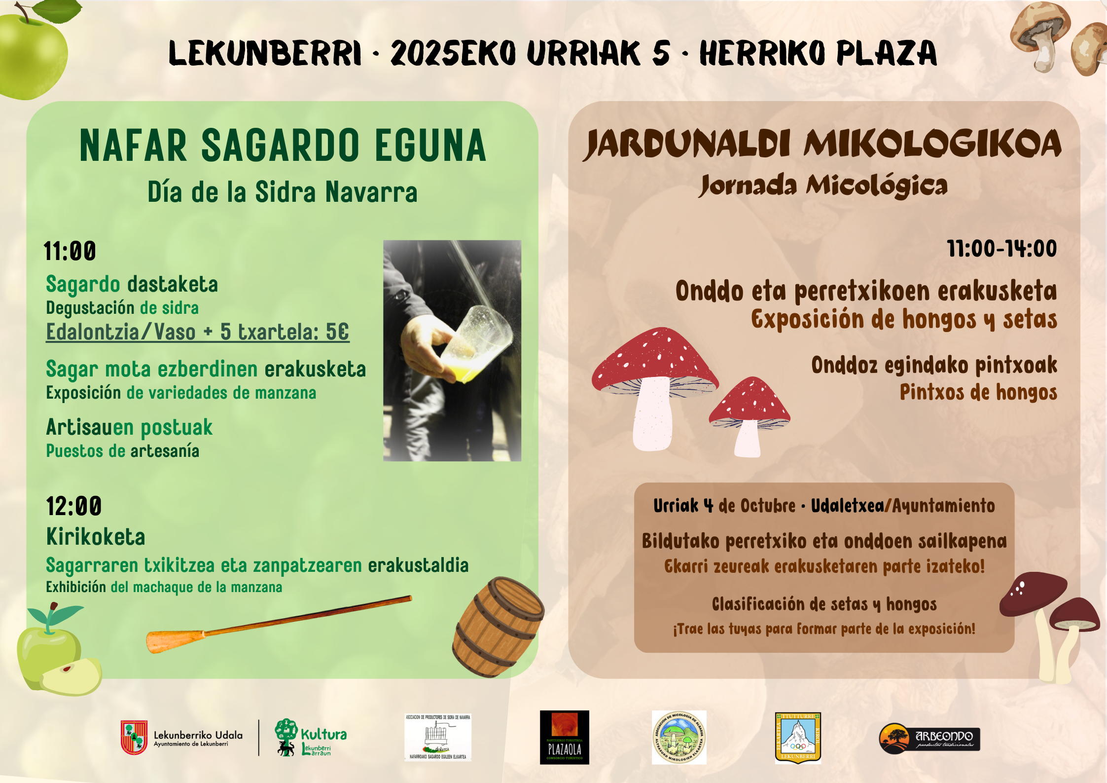 La XX edición de Sagardo Eguna, será este próximo domingo día 5 de octubre y compartirá protagonismo con la tradicional jornada micológica de Lekunberri.