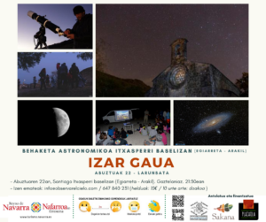 Observación astronómica en la ermita de Itxasperri (Egiarreta-Arakil) El sábado 22 de Agosto a las 21:30 habrá noche de estrellas muy especial en un lugar tan mágico como Santiago de ItxasperriSantiago de ItxasperriSan. Las plazas serán limitadas. Anímate a acudir contactando a: info@observarelcielo.com / 64784023. Adultos 10 € y hasta 10 años entrada gratuita