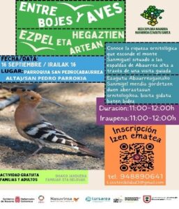 Conoce la riqueza ornitológica que esconde el monte Sanmiguel en Abaurrea alta a través de una visita guiada organizada por nuestros técnicos de sostenibilidad. Hora:00h Dónde: ABAURREA ALTA Guía: JUAN GOÑI Actividad gratuita Plazas limitadas Inscripciones: sostenibilidad3@gmail.com ( 948 890641)
