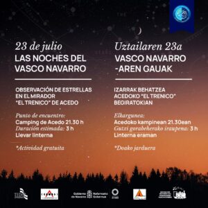 No te pierdas este sábado una doble cita en Acedo. Por la mañana, Paseo entre mariposas. Salida a las 10.30 desde el lavadero. (inscripción previa a través del correo electrónico teder@montejurra.com  o por teléfono 659777839)   Y por la noche Paseo nocturno con observación de estrellas. Salida a las 21.30 desde el camping de Acedo. Observación: sobre las 23 horas en el Mirador estelar “El trenico” (no es necesaria inscripción)
