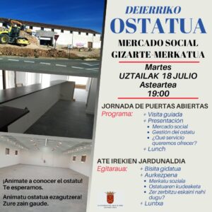 El mercado social del valle de Yerri abre sus puertas el próximo martes 18 de julio a las 19.00 horas. Se celebrará una visita guiada y se presentará el mercado social, la gestión del ostatu y el servicio que se desea ofrecer. Si quieres asistir inscríbete en este formulario: https://forms.gle/2pjh1tmkEMLahUU29